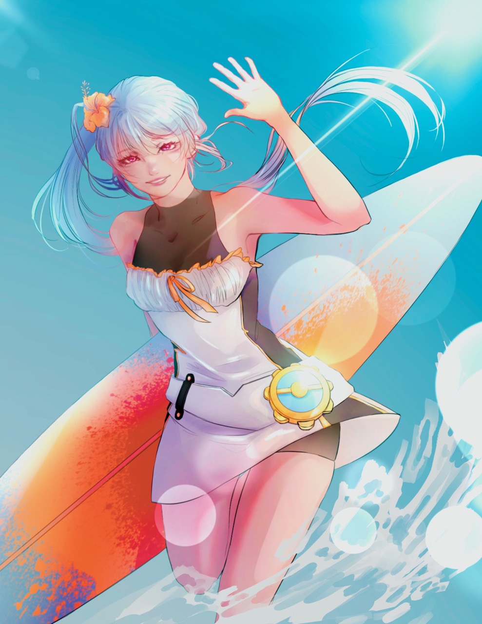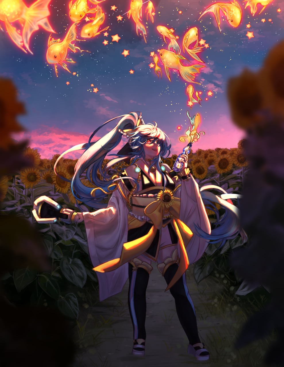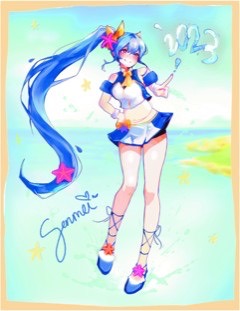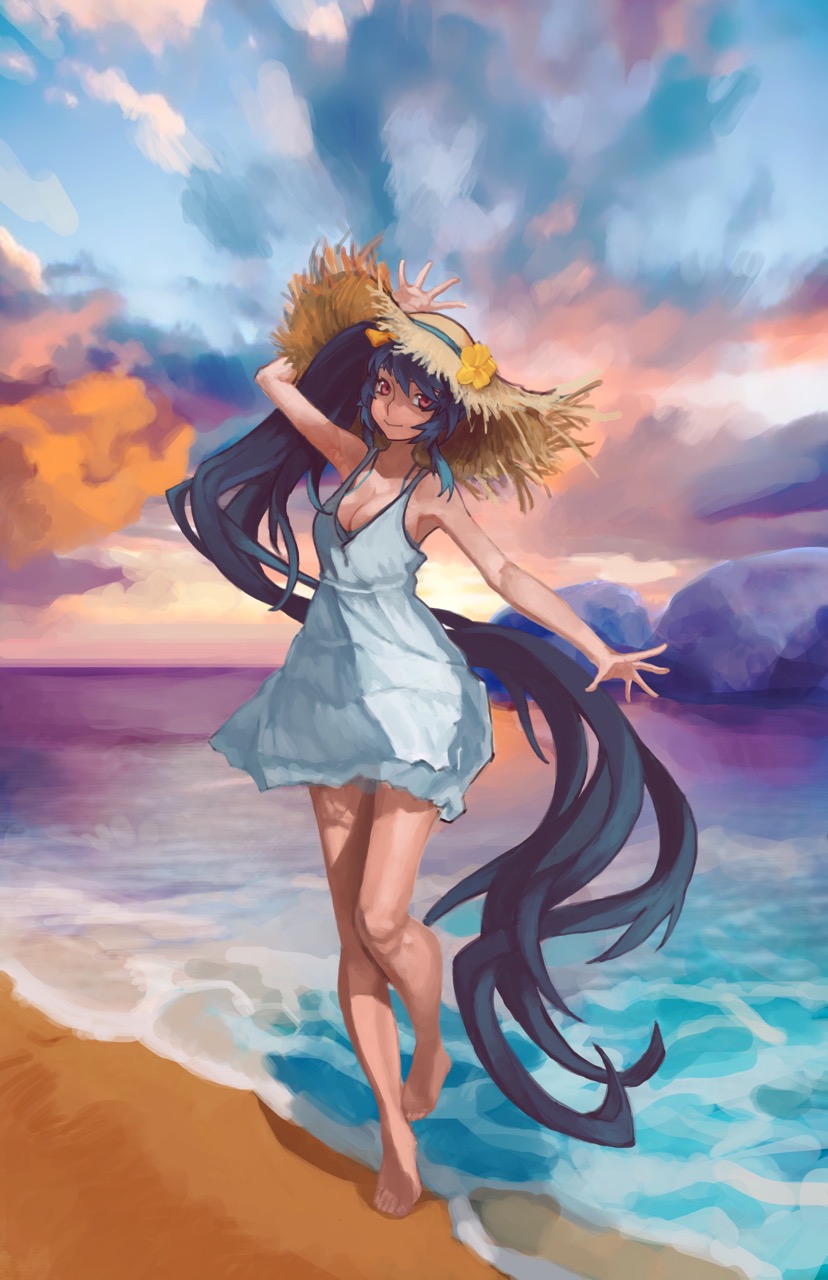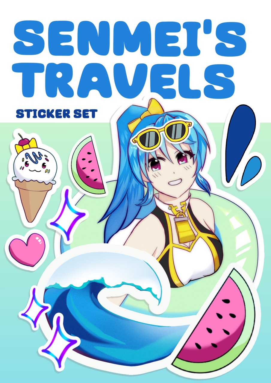 In my vision, I wanted to capture the essence of summer and the warmth that comes with it. Sunflowers/other summer flora and the beach came in mind when I envisioned the piece. I imagined Senmei having a jolly personality and wanted to show that through her pose, expression, combining that with the fluttering sundress to accentuate that side of her.