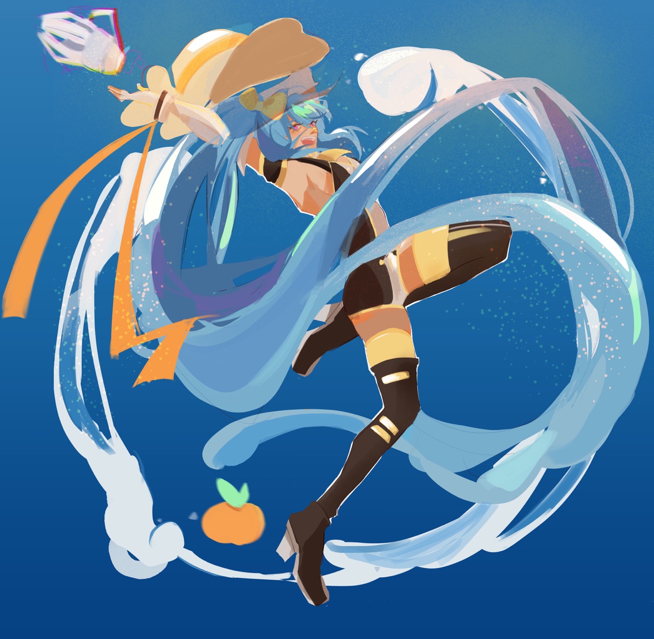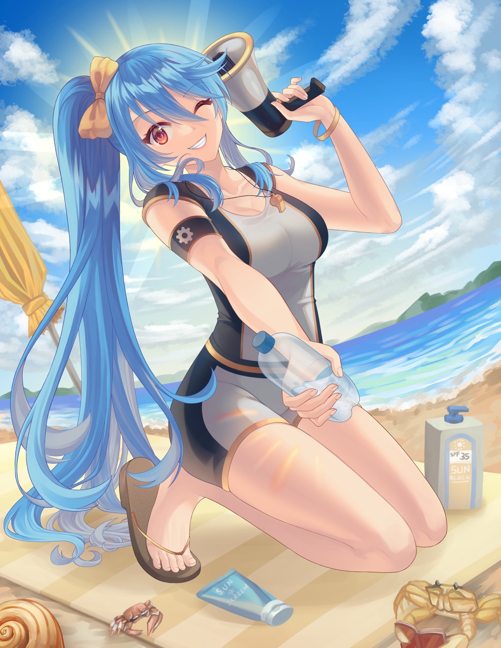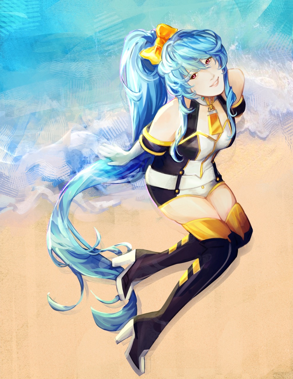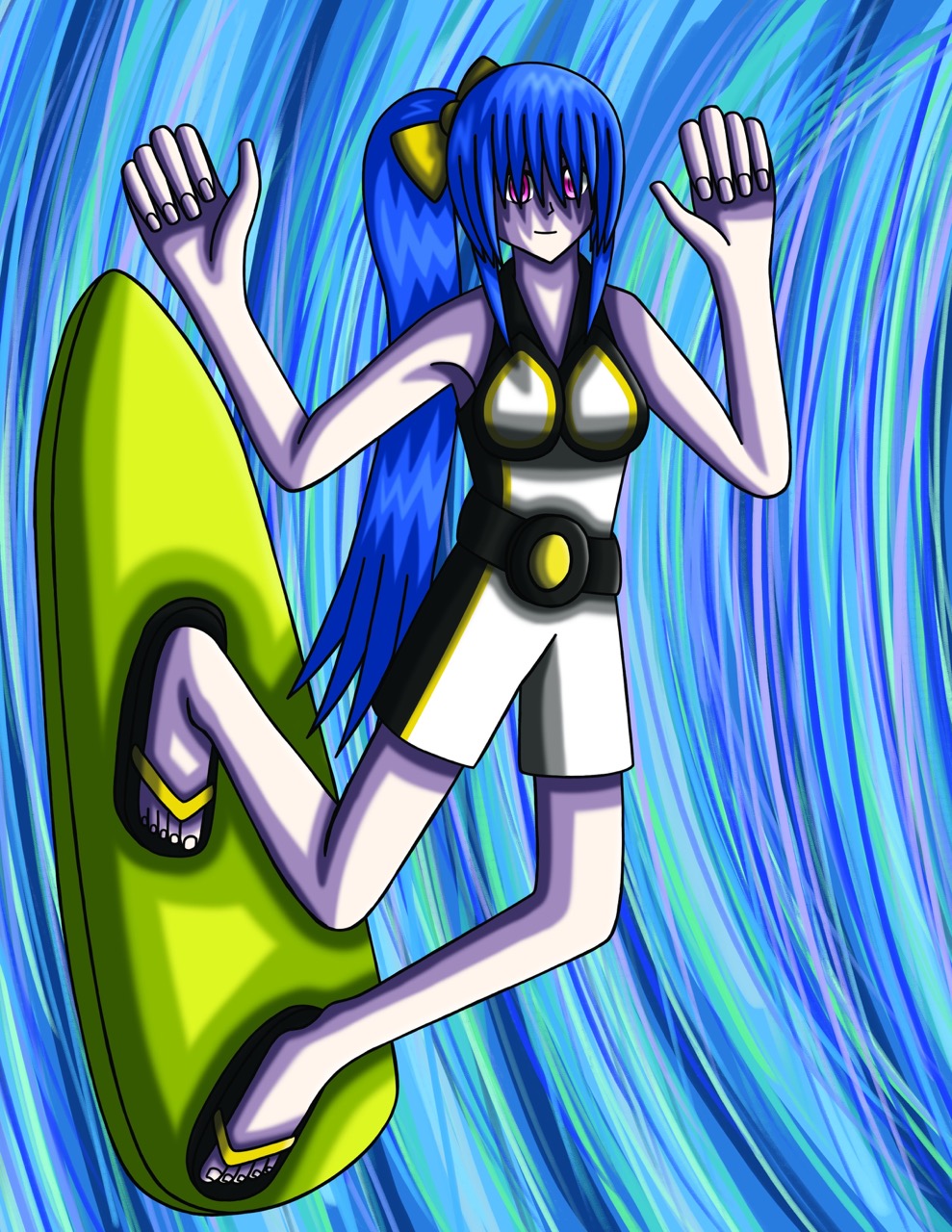 In my vision, I wanted to capture the essence of summer and the warmth that comes with it. Sunflowers/other summer flora and the beach came in mind when I envisioned the piece. I imagined Senmei having a jolly personality and wanted to show that through her pose, expression, combining that with the fluttering sundress to accentuate that side of her.